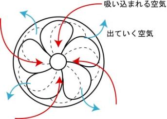 実際に送風機の吸入口をよく観察すると空気を吸い込む部分は中央部分で、吸入口の端の部分は逆に空気を排出しているのが