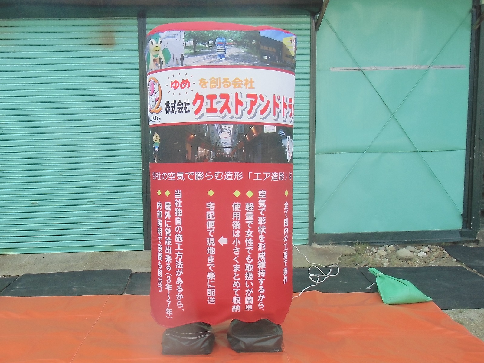 エア式看板とは、小型の送風機で膨らむ布製の電飾看板です。支柱には、一般的なのぼりの竿を使用していますので、お客様がお持ちののぼりの竿を転用することができ費用を節約できます。